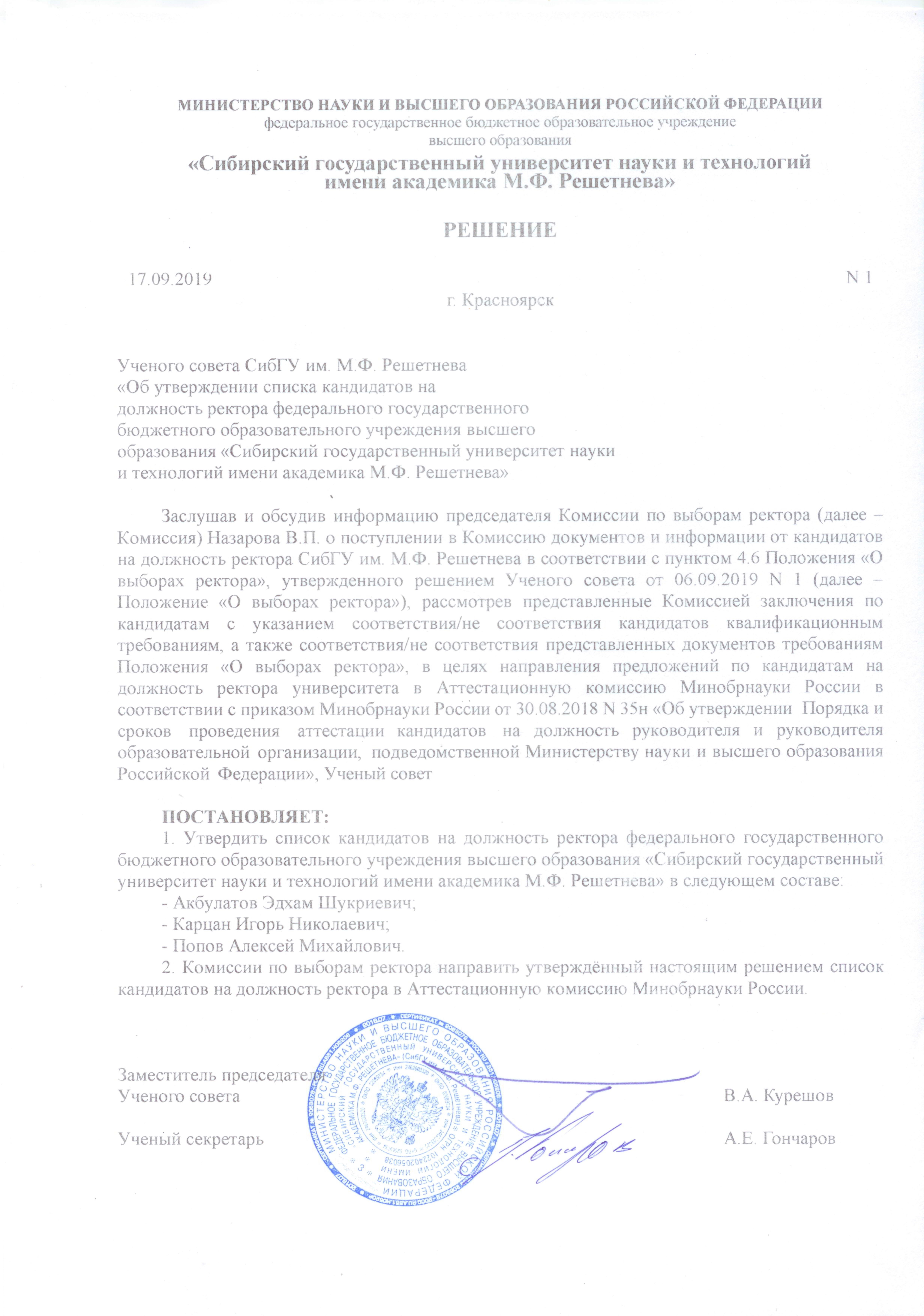 "О формировании списка кандидатов в состав избираемой части Ученого совета СибГАУ"