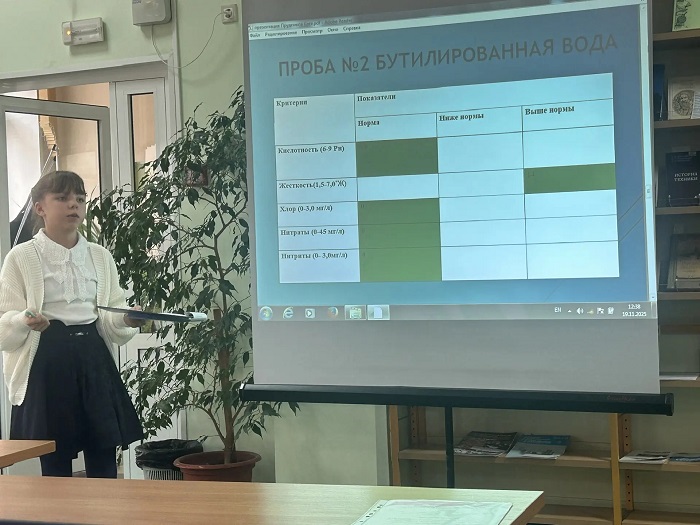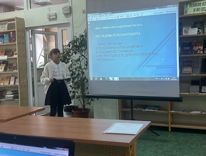 2 место – Екатерина Прудникова (6 кл.), МБОУ «Южно-Александровская СОШ № 5», доклад «Качество воды в селе Южно-Александровка из разных источников и ее пригодность для употребления человеком».