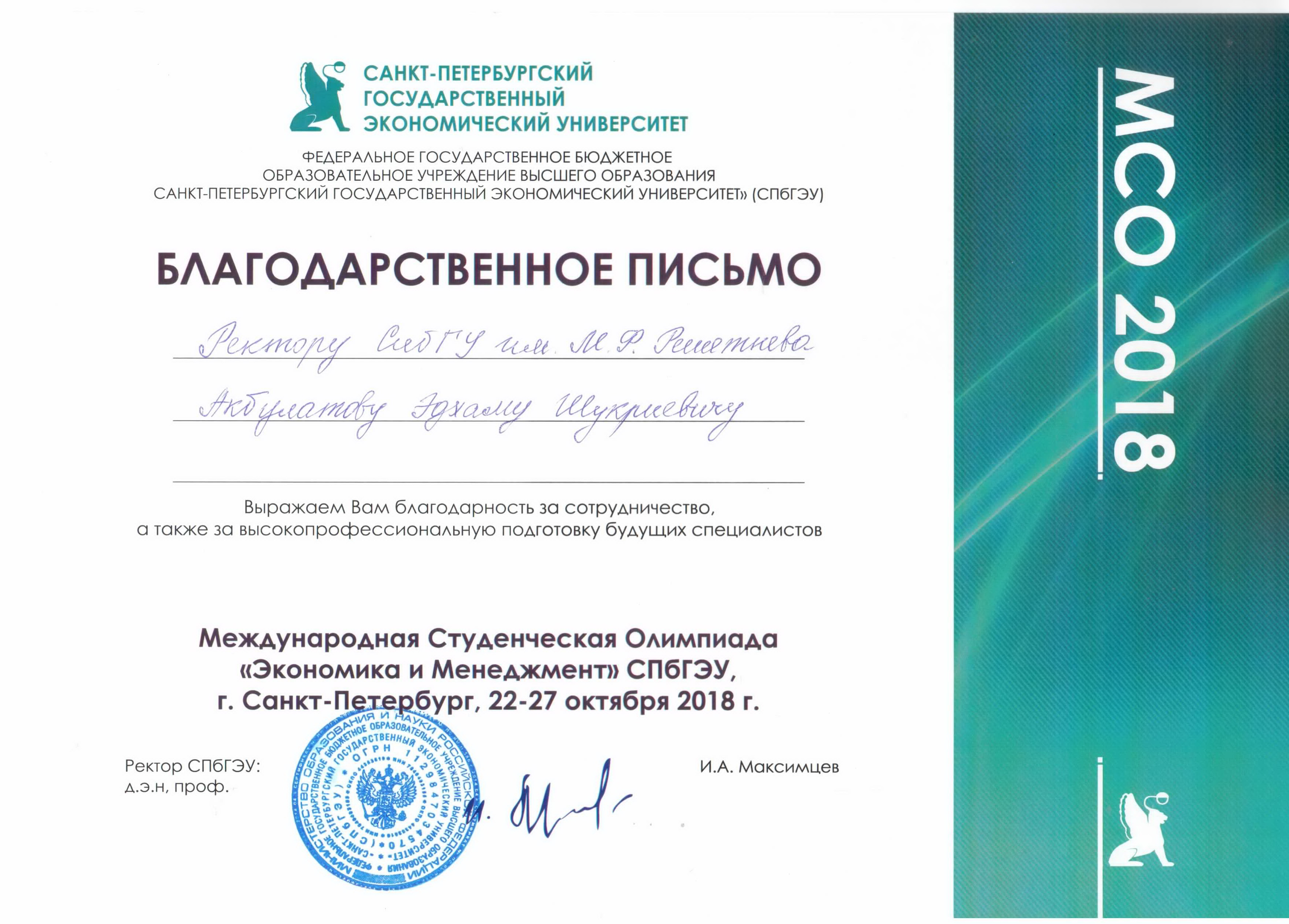 Дирекция ИЭИ выражает благодарность руководству университета за возможность представить вуз на международной олимпиаде «Экономика и менеджмент – 2018».